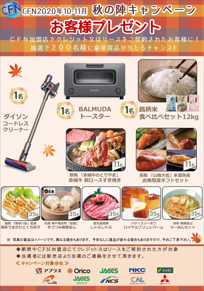 前回に引き続き期間中にCFN加盟店にて対象クレジットまたは対象リースのご契約をされた方の中から抽選で200名様へ賞品をプレゼント!!。